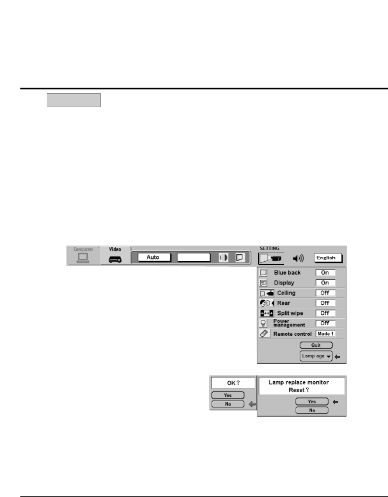 BUTTON. When you reset the lamp replace monitor, "lamp replace monitor reset?" is displayed for confirmation.